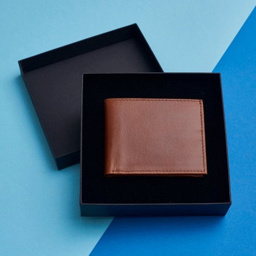 This leather wallet is available in dark tan or matte black (the Masterpiece engraving will show up much more clearly on the tan version).
