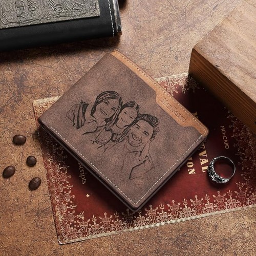 - Personalized Wallet: Photo Wallet with Engraving Gift for Men. Our Photo Wallet will capture a moment that is gone forever. The photo will never fall off! This photo wallet is designed to provide you with a quick and easy way to create a unique and useful souvenir.