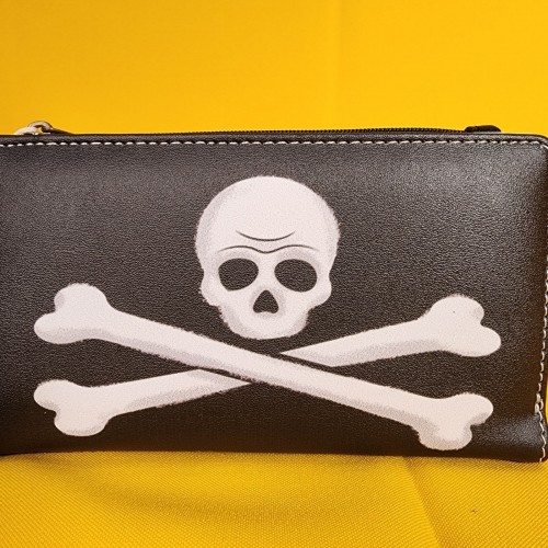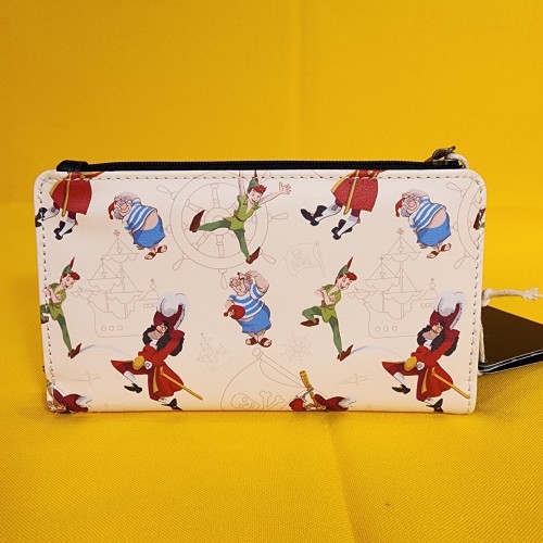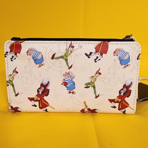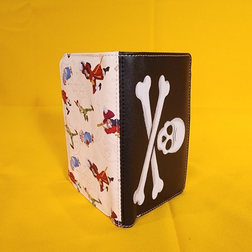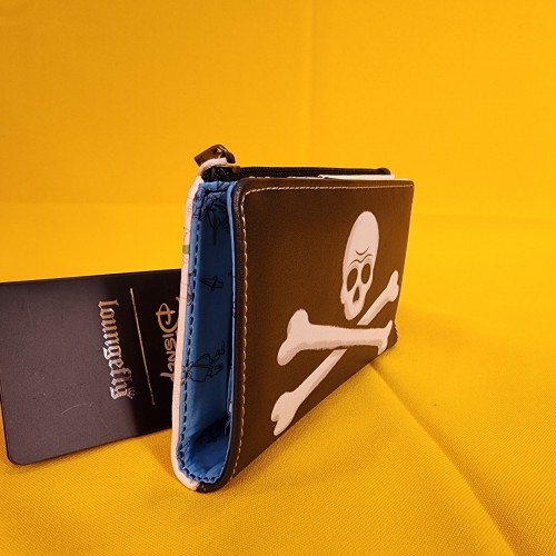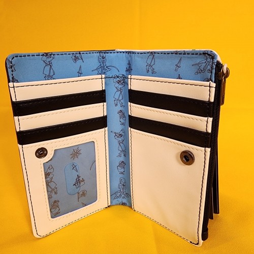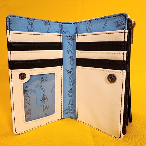 This wallet features the Jolly Roger symbol on the front. On the back, you’ll find images of Peter Pan, Captain Hook, and Mr. Smee surrounded by illustrations of pirate ships, Jolly Roger flags, and ship wheels. Inside, there are seven card slots and one clear slot for an ID.