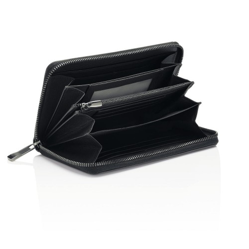 The vertically expandable wallet offers space for all important cards and receipts with six credit card slots, a coin compartment with snap fastener, a compartment for bills, a mesh compartment for IDs and a larger pocket for items such as business cards.