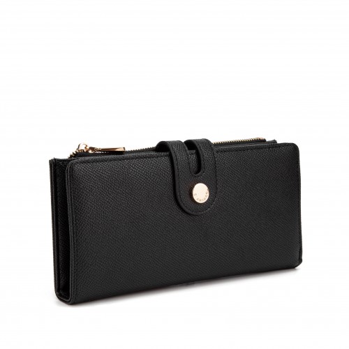 Portafoglio da donna. La chiusura è con bottone magnetico. Le tasche interne sono portacarte e porta banconote. Le tasche esterne sono assenti. La tracolla è assente. Il manico è assente. Gli scomparti interni sono uno. Il materiale esterno è Vegan Leather/Pu. Internamente è sfoderato. Misure: 9,5x19x3 cm . Prodotto Fashion
