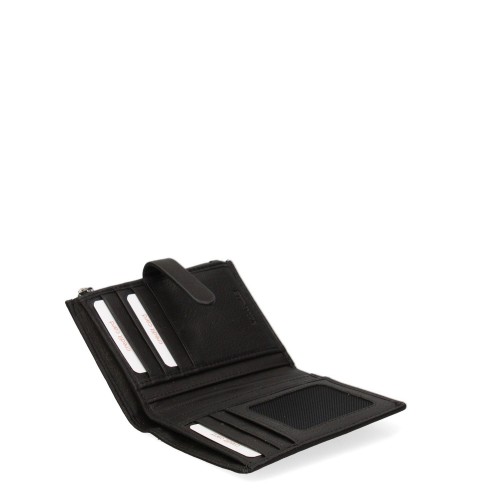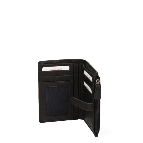 Portafoglio da donna. La chiusura è con bottone a pressione. Le tasche interne sono portacarte e porta banconote. Le tasche esterne sono assenti. La tracolla è assente. Il manico è assente. Gli scomparti interni sono uno. Il materiale esterno è 100% Vera Pelle. Internamente è foderato in vera pelle. Misure: 12,5x10x1,5 cm . Prodotto Fashion