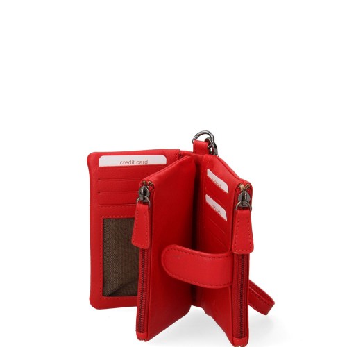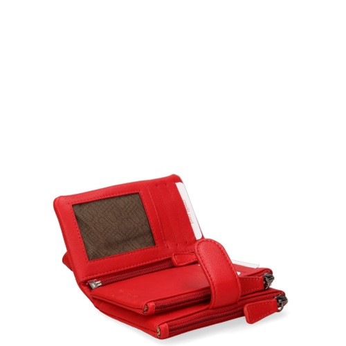 Portafoglio da donna. La chiusura è con bottone a pressione. Le tasche interne sono portacarte e porta banconote con tasca zip. Le tasche esterne sono una posteriore con zip. La tracolla è assente. Il manico è assente. Gli scomparti interni sono uno. Il materiale esterno è 100% Vera Pelle. Internamente è foderato in vera pelle. Misure: 13,5x10x3 cm . Prodotto Fashion