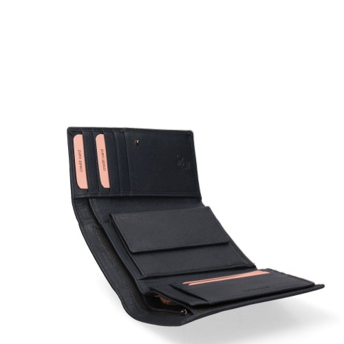 Portafoglio da donna. La chiusura è con bottone a pressione. Le tasche interne sono portacarte porta banconote e porta monete. Le tasche esterne sono assenti. La tracolla è assente. Il manico è assente. Gli scomparti interni sono uno. Il materiale esterno è 100% Vera Pelle. Internamente è foderato in vera pelle. Misure: 15×10,5×3 cm . Prodotto Fashion