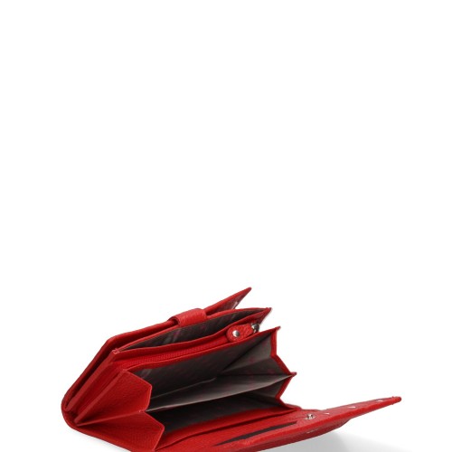 Portafoglio da donna. La chiusura è con bottone a pressione. Le tasche interne sono portacarte e porta banconote. Le tasche esterne sono assenti. La tracolla è assente. Il manico è assente. Gli scomparti interni sono uno. Il materiale esterno è 100% Vera Pelle. Internamente è foderato in vera pelle. Misure: 15x11x3,5 cm . Prodotto Fashion