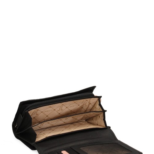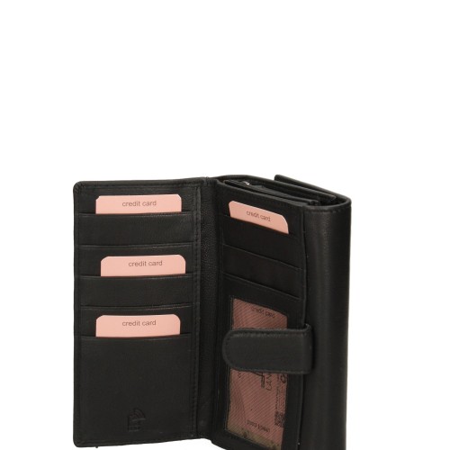 Portafoglio da donna. La chiusura è con bottone a pressione. Le tasche interne sono portacarte e porta banconote con tasca zip. Le tasche esterne sono una posteriore con clip. La tracolla è assente. Il manico è assente. Gli scomparti interni sono uno. Il materiale esterno è 100% Vera Pelle. Internamente è foderato in vera pelle. Misure: 17x10x4 cm . Prodotto Fashion