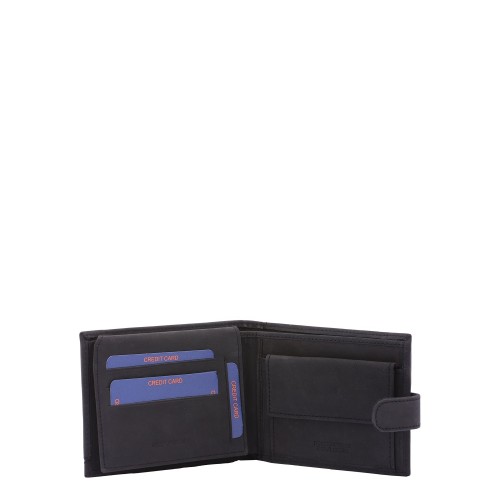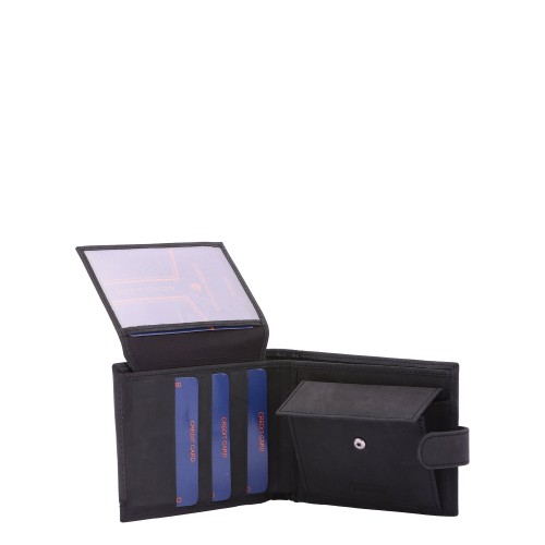 Portafoglio da uomo. La chiusura è con bottone a pressione. Le tasche interne sono una con zip, portacarte, portabanconote e portamonete. Le tasche esterne sono assenti. La tracolla è assente. Il manico è assente. Gli scomparti interni sono tre. Il materiale esterno è 100% Vera Pelle. Internamente è foderato in vera pelle. Misure: 10,5x13x3 cm . Prodotto Fashion