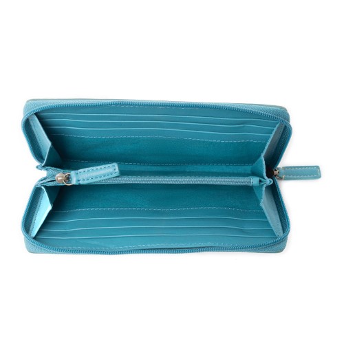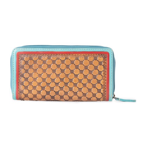 The Potamophilous Wallet is a striking blend of Western charm and modern style. Featuring beautifully hand-tooled leather, this leather zipper wallet’s neutral tones are perfectly contrasted by a bold turquoise zippered top, adding a vibrant touch. Designed for both style and security, this rodeo wallet offers RFID protection, multiple card compartments, and an inside zipper pocket for effortless organization.Â