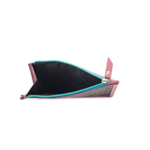 Desert bloom meets functional fashion with this slim card wallet featuring hand-painted cactus and turquoise flowers on tooled leather. Pink trim and convenient ID window make organization stylish and effortless. Carry your essentials easily while you’re on the go!