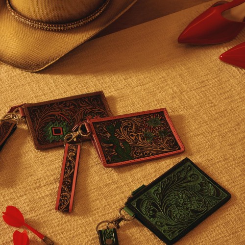 Desert bloom meets functional fashion with this slim card wallet featuring hand-painted cactus and turquoise flowers on tooled leather. Pink trim and convenient ID window make organization stylish and effortless. Carry your essentials easily while you’re on the go!