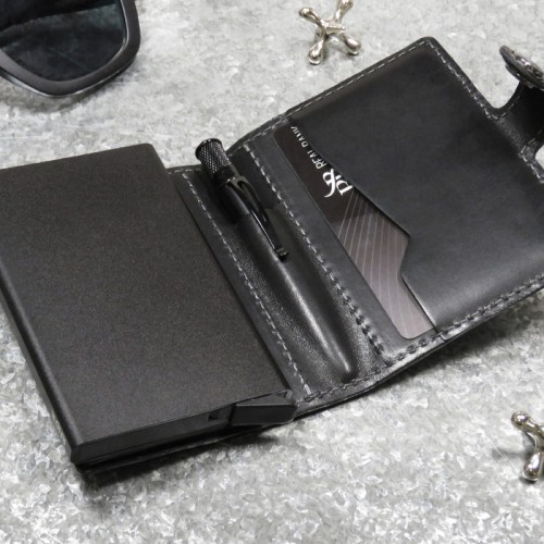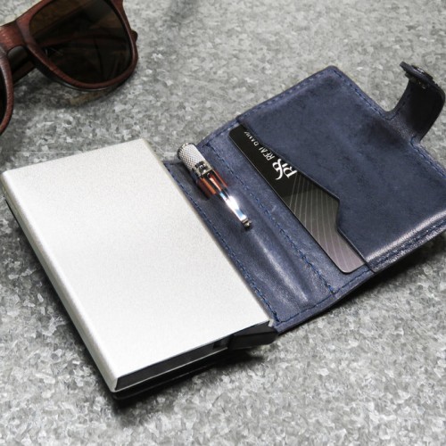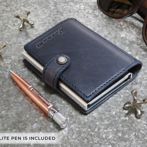 The Modern Traveler is manufactured by our friends Pularys using genuine leather, their aluminum case with RFID protection and quick card release lever, plus a Tornado™ Elite Ballpoint pen in a complimentary color. Stored in a small pocket, you’ll always have a writing tool handy when you’re on the move or want to capture spontaneous brilliance.
