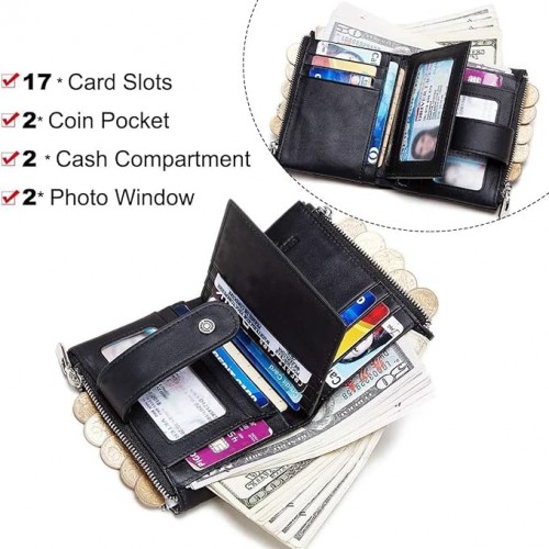 - [Stylish & Secure] The RFID blocking feature provides peace of mind, while the sleek Real Leather design with a chain adds both style and function. The wallet’s compact size and secure closures make it an excellent choice for men on the go