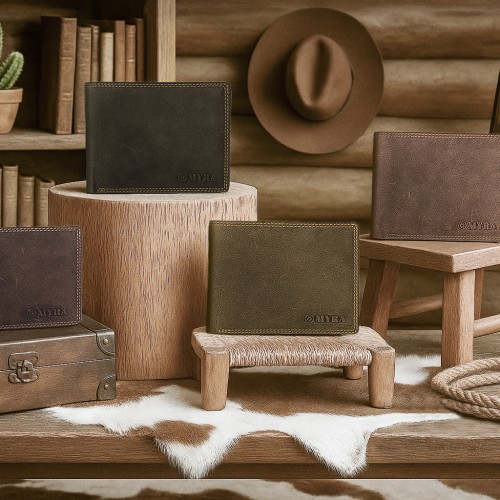 This men’s wallet features a classic bifold design in rugged distressed brown leather. The wallet showcases distinctive double-row contrast stitching along the edges, adding both durability and visual interest. The minimalist exterior has a weathered finish that gives it a refined yet rustic appearance.