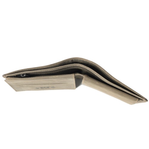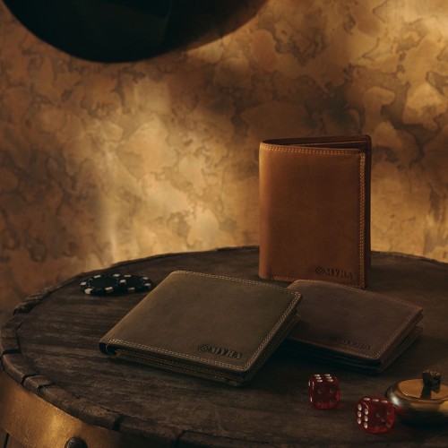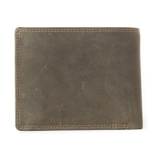 This men’s wallet features a classic bifold design in rugged distressed brown leather. The wallet showcases distinctive double-row contrast stitching along the edges, adding both durability and visual interest. The minimalist exterior has a weathered finish that gives it a refined yet rustic appearance.