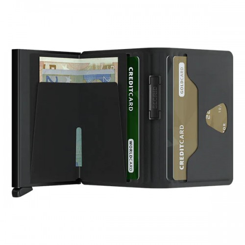 Its slim profile makes the Slimwallet fit perfectly into every pocket. The open exterior is cut extra wide to hold cards, banknotes and receipts. The Cardprotector mechanism allows you to slide out cards with one simple motion, while the aluminium protects your cards from bending, breaking and unwanted wireless communication.