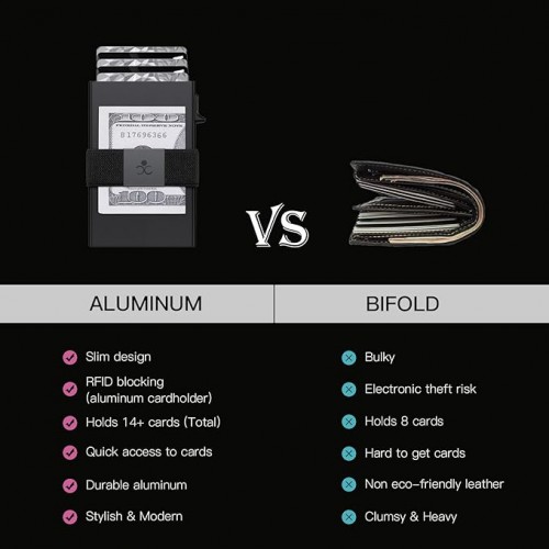 - 🔒 RFID & NFC BLOCKING: This smart wallet use advanced aluminium technology to protect your cards from unauthorized and contactless scanning. Stop thieves from cloning your bank cards and prevent data theft.