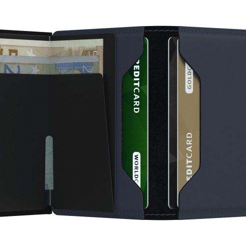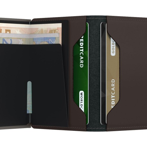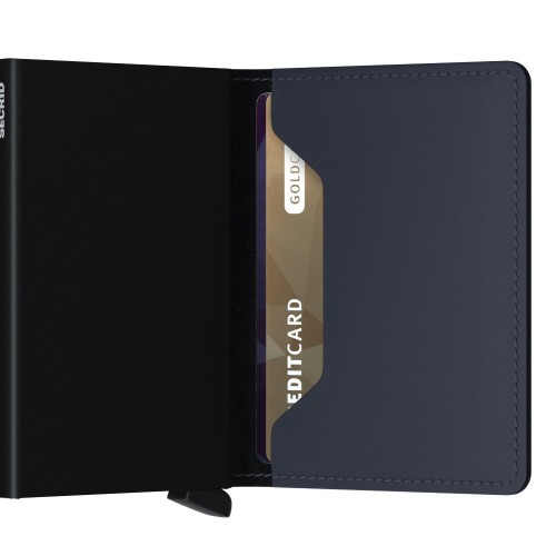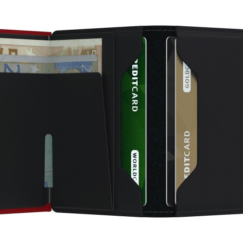Each Slimwallet has the aluminum Cardprotector inside. The patented mechanism provides a simple and fast access to your cards. Push the lever and the cards slide out smoothly, ready for immediate use. The strong case protects the cards against bending, breaking and unauthorised wireless scanning.