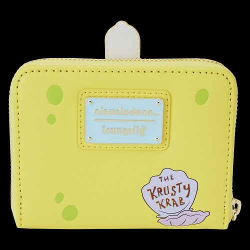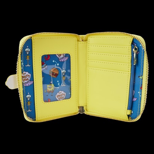 Welcome to the Krusty Krab! The Loungefly SpongeBob 25th Anniversary Zip Around Wallet takes the shape of the beloved underwater fry cook. On the front, SpongeBob SquarePants wears his signature uniform as embroidered details highlight his facial features below. Sponge circles continue onto the back, where the Krusty Krab’s clamshell sign makes an appearance. Open the wallet to reveal four slots for holding cards and a clear slot for ID. Whether you’re clocking in for your next shift or having fun on your day off, this accessory will keep you ready for your next adventure.