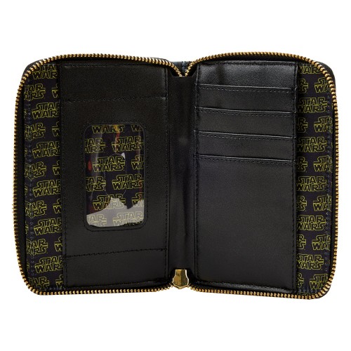 Journey back to where it all began. The Loungefly A New Hope Final Frames Zip Around Wallet features cinematic moments from the legendary first film in the Skywalker saga. On the front, Luke Skywalker takes in the view of Tatooine. On the back, Princess Leia consults a map. With four slots for holding cards and a clear slot for holding ID, this galactic accessory is the perfect addition to any Star Wars™ collection.