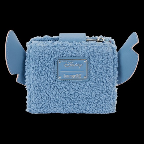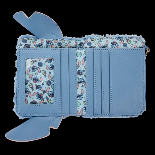 Need to escape? Our Loungefly Disney Stitch Plush Bifold Wallet makes the perfect accomplice! Soft blue sherpa fabric covers the outside of this wallet. On the front, Stitch’s face appears, brought to life in embroidered detail. His applique ears poke out from the sides of the wallet. The snap, just under his nose, opens to reveal approximately six slots for holding cards and one clear slot for displaying your ID. A die-cut shape of a planet adds a signature touch. Embrace your journeys in style with this fun accessory.
