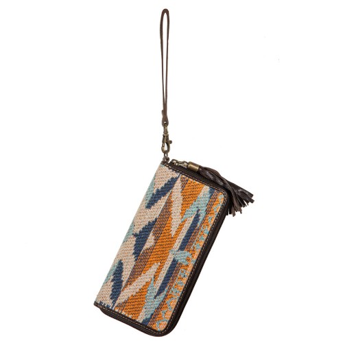Embrace Western charm with this stunning cowgirl clutch from our Sun Serape collection. The upcycled woven rug features a bold tribal-inspired pattern, beautifully accented with genuine leather. A wrap-around zipper closure ensures everything stays secure, while the interior offers ample space, including an inside zipper pocket and credit card compartments. Complete with a matching leather wristlet strap, this western leather wallet is as functional as it is stylish. Perfect for free spirits who love a blend of tradition and artistry.