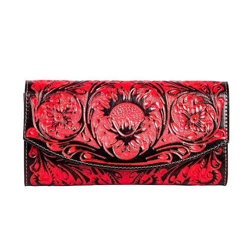 This gorgeous wallet is a bold statement of elegance and organization. This vibrant red leather masterpiece features exquisite embossed floral designs, blending vintage charm with modern sophistication. With its spacious interior, multiple card slots, and secure warp-around zipper closure, it’s the perfect accessory for the woman who demands both style and functionality in her everyday accessories!