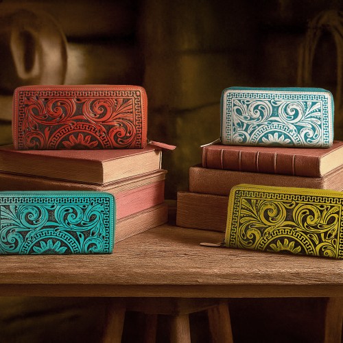 This gorgeous wallet is a lovely statement of elegance and organization. This beautiful white contrast turquoise leather masterpiece features exquisite embossed floral designs, blending vintage charm with modern sophistication. With its spacious interior, multiple card slots, and secure warp-around zipper closure, it’s the perfect accessory for the woman who demands both style and functionality in her everyday accessories!