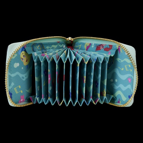 The Loungefly Disney The Little Mermaid 35th Anniversary “Life is the Bubbles” Accordion Wallet is made of vegan leather. Other features include gold-colored metal hardware, printed, glow-in-the-dark, and applique details. Take note of the coordinating inside lining.