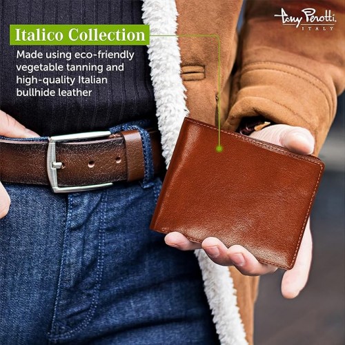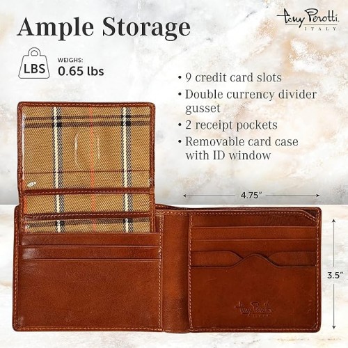- Organization & Features: This classic men’s Italian leather bifold wallet with ID window flap is simple yet surprisingly elegant and practical. Features nine credit card slots, a removable ID window flap, two receipt pockets, and a double currency divider. Comes in a Luxurious Signature Tony Perotti Fabric Gift Envelope. Dimensions: 4.75″(L) x 3.5″(H) x 0.5″(W). Weight: 0.65 lbs