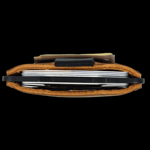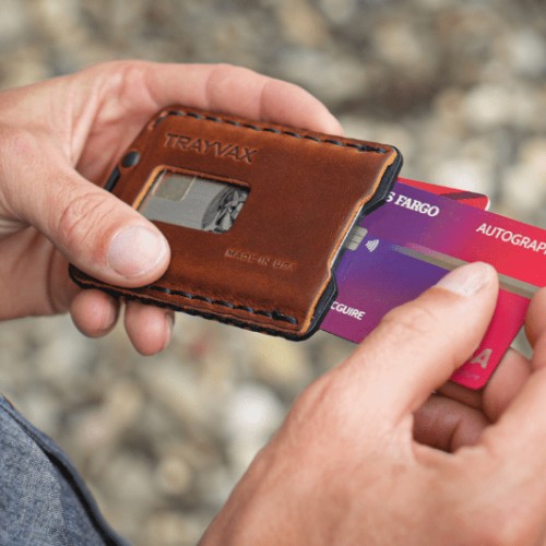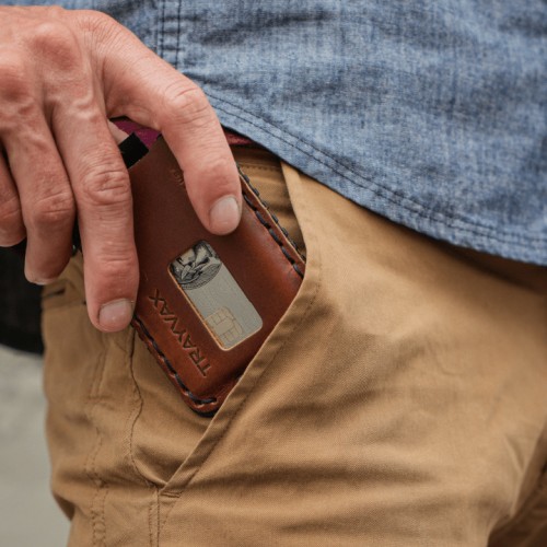 The Trayvax Ascent in Black Tobacco Brown, is a tough, front pocket wallet that’s with you for the long haul. The Ascent boasts a single, stainless steel plate, notched on both sides for a comfortable grip. Top grain, oil-tanned leather is carefully hand-stitched through the steel plate and secured in place with brass rivets. Carry only what you need on your journey with this slim, dual-slot credit card holder. Over time, the leather will form around the contents of your wallet and develop a patina unique to your lifestyle.