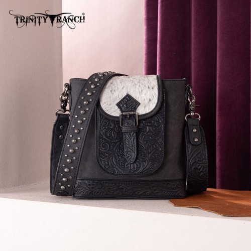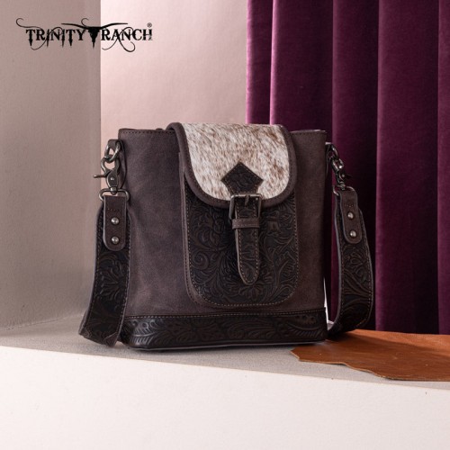- Floral tooled and genuine hair-on cowhide