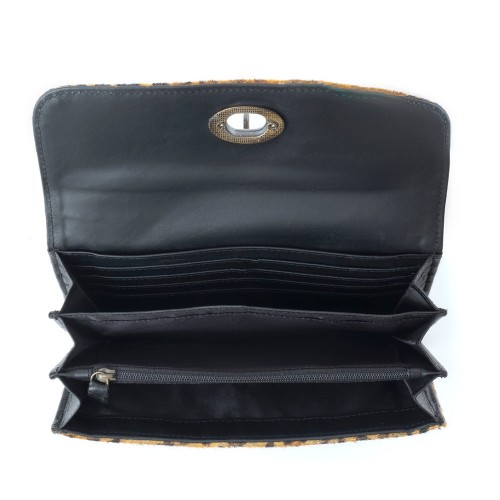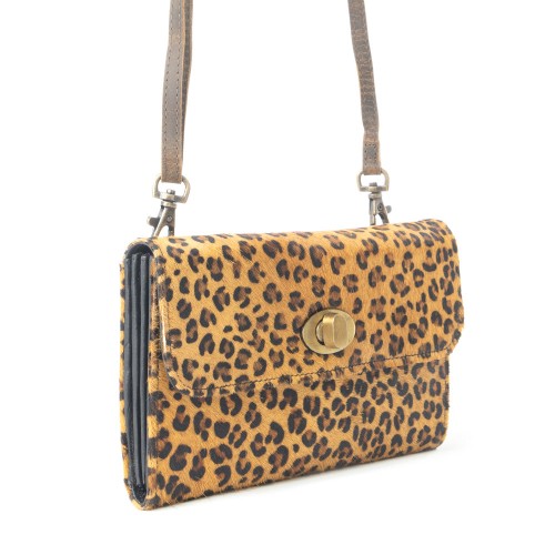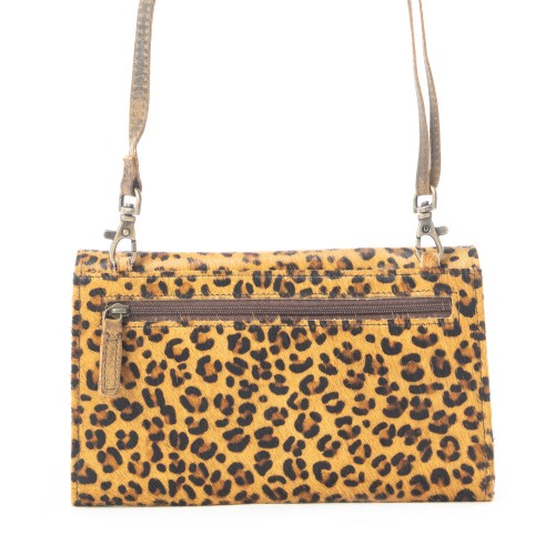 Make a bold statement with the Myra Twilight Wallet, a stunning fusion of Western charm and modern functionality. Crafted from genuine leather with a striking hairon leopard print, this cowgirl wallet is perfect for those who love a rugged yet stylish vibe. Designed for security and convenience, it features an RFID protector and inside chambers for effortless organization. The adjustable leather strap of this western wallet allows for versatile carrying, while the zippered back slot ensures quick access to essentials.