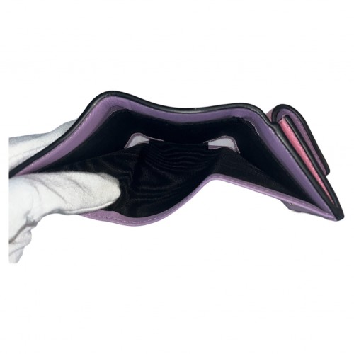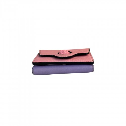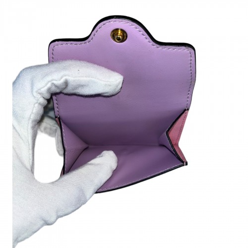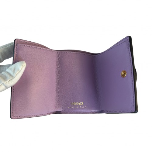 Versace La Medusa Wallet in pink/lilac. Wallet features leather exterior and interior, interior card slot, foldable bill compartment, two button closures, detachable chain-link shoulder strap, and gold-toned hardware. Wallet is in very good condition with slight wear to Medusa face. Certificate of authenticity, courtesy of Entrupy, included. Made in Italy.