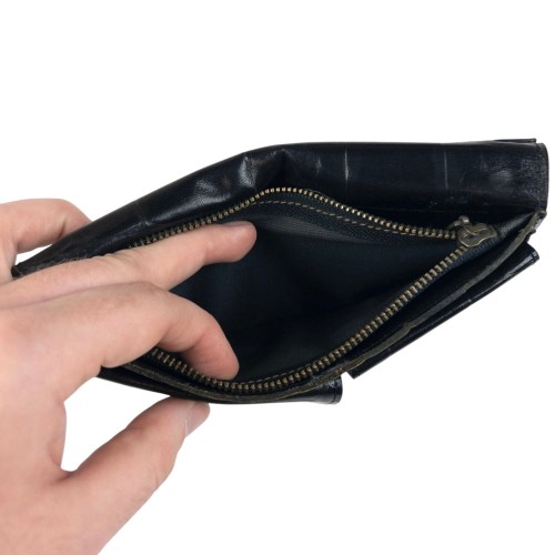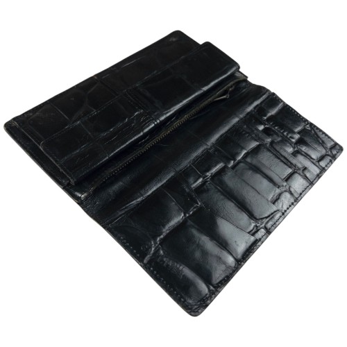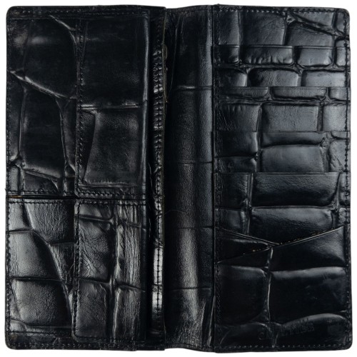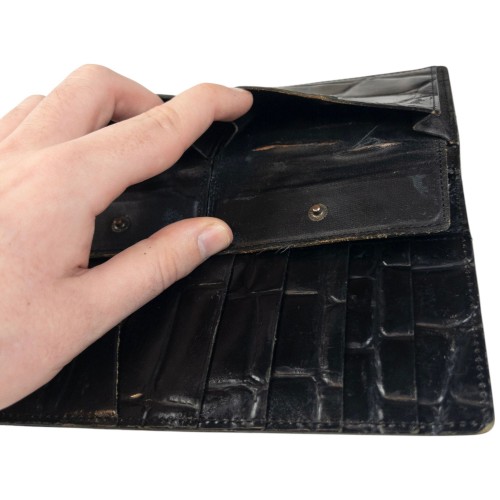 - Other info: Black colour, embossed branding, crocodile scale texture design, fold purse style, visible scuffs and wear as seen, some discolouration and marks as shown, 3.5x7in closed measurement, 7x7in open measurement