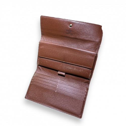 Vintage Louis Vuitton wallet from late 80’s collection. Wallet features classic monogram print to coated canvas exterior, brass-toned hardware, tri-fold opening, button snap closure to front, and multiple compartments to interior. Item is in fair vintage condition with signs of wear to interior and exterior in line with age. Certificate of authenticity courtesy of Entrupy included. Made in France.