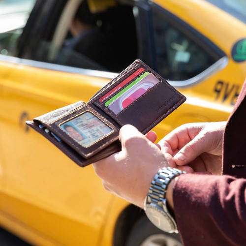 The Voyager Leather Tri-Fold Wallet is your everyday solution for cards and cash. Made from full-grain buffalo leather, it has a classic design with tri-fold construction, an ID window, slip pockets for your notes and receipts, and seven slots for your credit card, membership cards, insurance cards, cash, etc. This handmade leather wallet features: