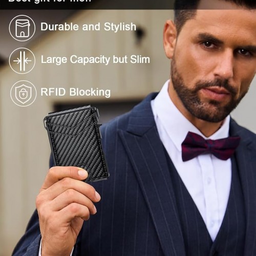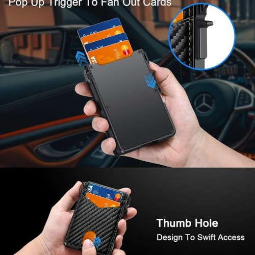- QUICK ACCESS: Unlike traditional leather wallet, this mens slim wallet is equipped with the ejection mechanism. Simply press the side button on the card holder, all cards pop up at a step pattern that makes them very easy & convenient to take out.