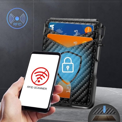 - RFID BLOCKING: This rfid wallet for men embeds a chip in the aluminum card case to block unknown scanning devices from scanning your credit cards, debit cards, and driver’s licenses, maximizing the protection of your personal property.