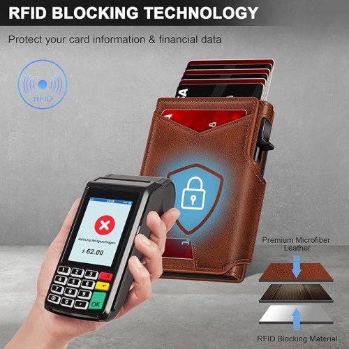 - QUICK & EASY CARD ACCESS: Unlike traditional leather wallets, SEMORID rfid wallet for men features an aluminum card case with an eject mechanism. Simply press the button and all cards pop out in a stepped pattern, making retrieval quick and convenient.