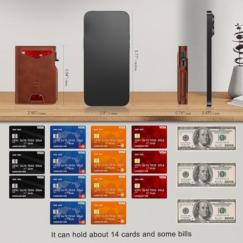 - SLIM BODY WITH LARGE CAPACITY: This slim wallet for men fits easily into front pocket, holding up to 10 cards (5-7 in aluminum case, 3 in leather cover with ID window), plus cash slot for 3 more cards.