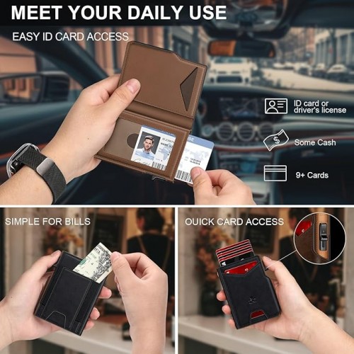 - TRANSPARENT ID WINDOW: The credit card wallet for men includes a transparent ID slot on the inside, perfect for storing your ID, work badge, driver’s license, access card, or transit pass.
