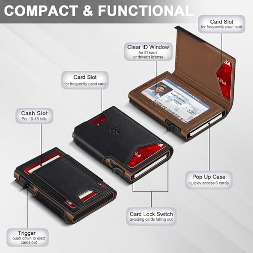 - QUICK & EASY CARD ACCESS: Unlike traditional leather wallets, SEMORID rfid wallet for men features an aluminum card case with an eject mechanism. Simply press the button and all cards pop out in a stepped pattern, making retrieval quick and convenient.