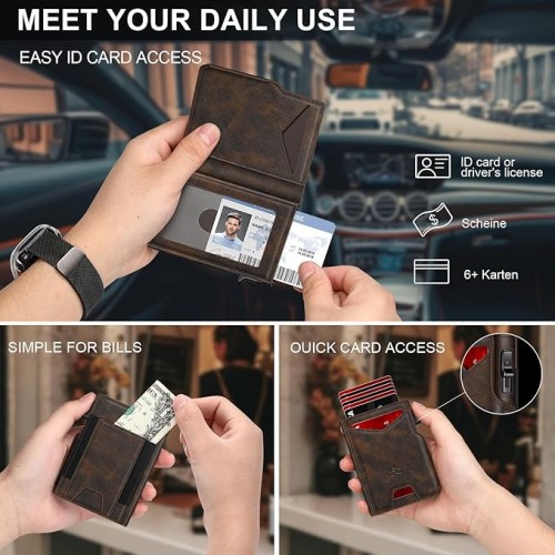 - TRANSPARENT ID WINDOW: The credit card wallet for men includes a transparent ID slot on the inside, perfect for storing your ID, work badge, driver’s license, access card, or transit pass.