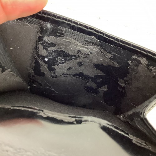 Other Info: AS IS significant wear: scuffing, leather creasing, leather pealing in lining of outer pocket.