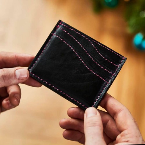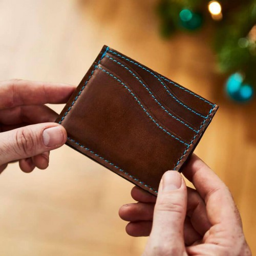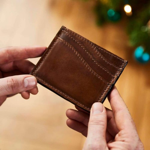 We have handmade this card holder using hardwearing, distressed buffalo leather and a simple, functional design, which will keep your cards safe. You can also fold notes into it, making it an extremely slim-fit wallet.