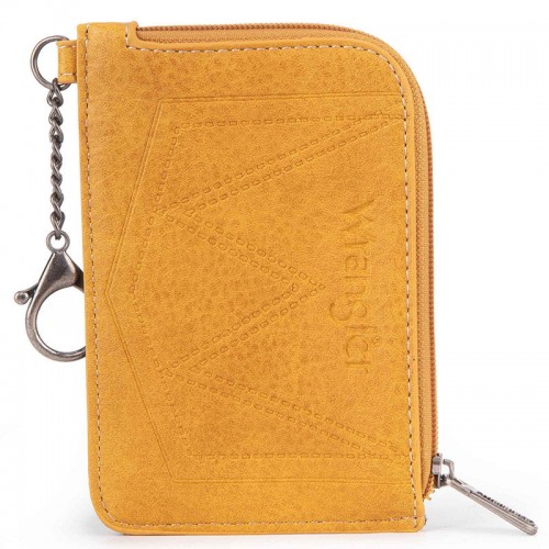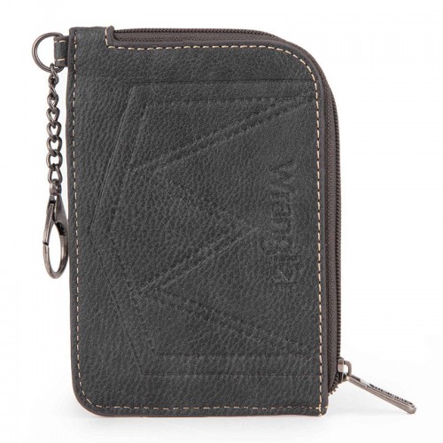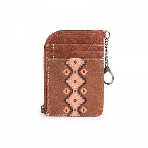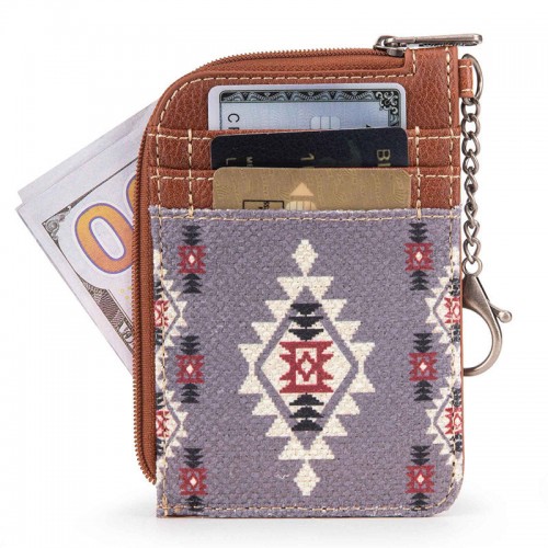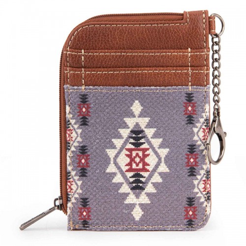 Made of Synthetic leather and canvas, this mini zip card case has: