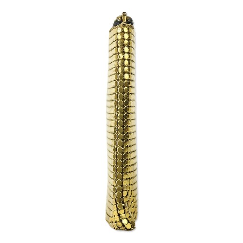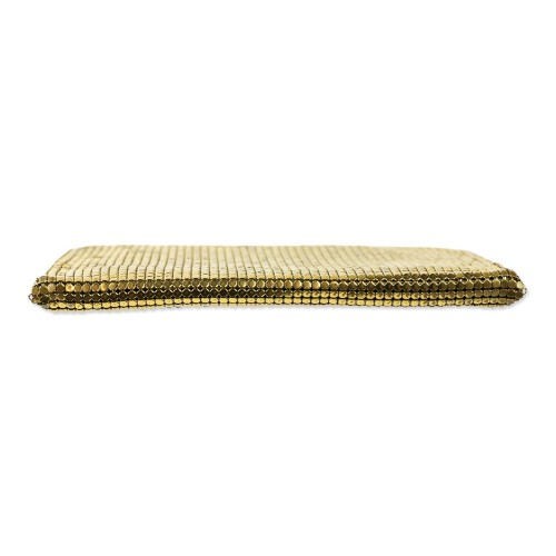 This vintage Whiting & Davis zip wallet is a classic example of the brand’s iconic metal mesh craftsmanship. Shimmering in a radiant gold tone, the mesh exterior provides a fluid, textile-like feel that is both durable and glamorous. The compact design features a secure top zip closure and is perfectly sized to function as a large wallet or a small hand-held clutch for evening essentials.