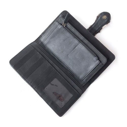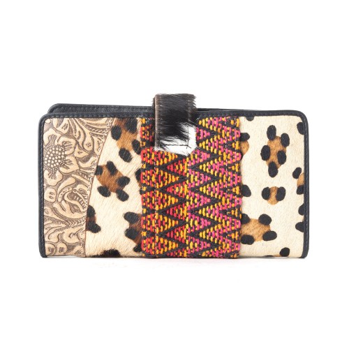 A bold blend of textures and patterns, this western wallet is a true statement piece for lovers of unique, Western-inspired accessories. Combining hairon leather, rug, and embossed leather patchwork, this wallet seamlessly merges artisanal craftsmanship with a quirky, eye-catching design. This Myra wallet offers RFID shielding, an inside zippered pocket, a phone slot, and an organized card holder. All in all, it adds a playful yet sophisticated touch to any outfit.