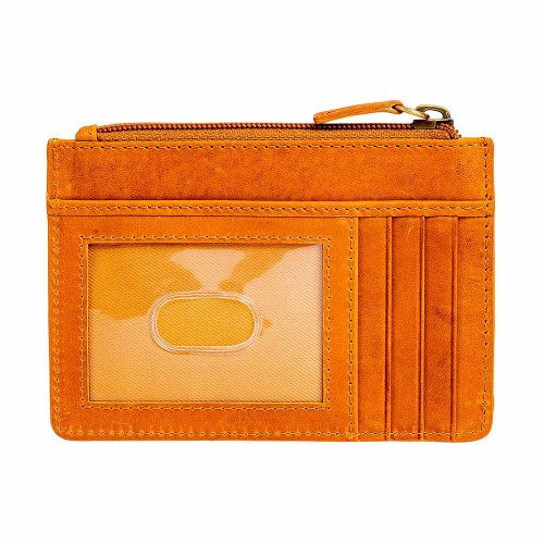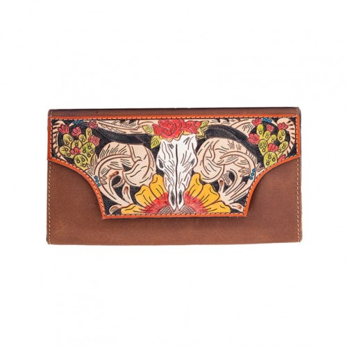 This delightful wallet offers compact form with high function in beautiful hand-tooled caramel leather. Features a central zippered pocket and several slots for cards and ID on the side. You’ll love its look and great size.