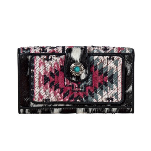 You’ll love the sophistication and beautiful leather of this alluring wallet. The front showcases luxurious brown and white hair-on hide, while the back boasts intricate embossed leather artistry. Inside, find ample card slots and a convenient ID window. Compact yet spacious, this wallet marries untamed beauty with practical elegance for the modern, style-conscious woman. Snaps closed.